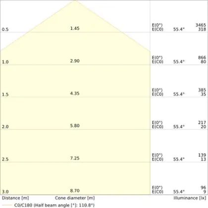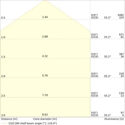 De lichtopbrengst (Lumen), geeft weer hoe krachtig het uitgestraalde licht is. Dit is belangrijk om te weten om de juiste sfeer te creëren. 0 tot 400 Lumen is bij uitstek geschikt voor accent- of sfeerverlichting. Een hoger aantal Lumen is, afhankelijk van de grootte van de ruimte, beter geschikt als ondersteunende- of basisverlichting. Heb je plafonds hoger dan 4 meter, dan is een lichtopbrengst van minimaal 8000lm aan te raden indien heldere verliching gewenst is (vb. in werkomgevingen).