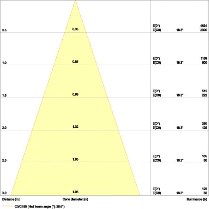 De gradenbundel geeft informatie over hoe breed het licht wordt uitgestraald. Dit zit tussen de 0 en 360 graden (D). Hoe kleiner de hoek, hoe specifieker de lichtbundel is. Over het algemeen is een smalle gradenbundel perfect voor sfeer- of accentverlichting, terwijl een brede gradenbundel ideaal is om grote oppervlaktes te verlichten.