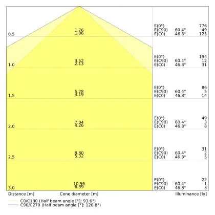 De lichtopbrengst (Lumen), geeft weer hoe krachtig het uitgestraalde licht is. Dit is belangrijk om te weten om de juiste sfeer te creëren. 0 tot 400 Lumen is bij uitstek geschikt voor accent- of sfeerverlichting. Een hoger aantal Lumen is, afhankelijk van de grootte van de ruimte, beter geschikt als ondersteunende- of basisverlichting. Heb je plafonds hoger dan 4 meter, dan is een lichtopbrengst van minimaal 8000lm aan te raden indien heldere verliching gewenst is (vb. in werkomgevingen).